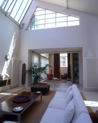 Il loft, su due livelli, è caratterizzato dalla presenza di una scala elicoidale in ferro e cemento che conduce dal piano terra al piano soppalco e dall’inserimento di due giardini interni nella zona pranzo-cucina.